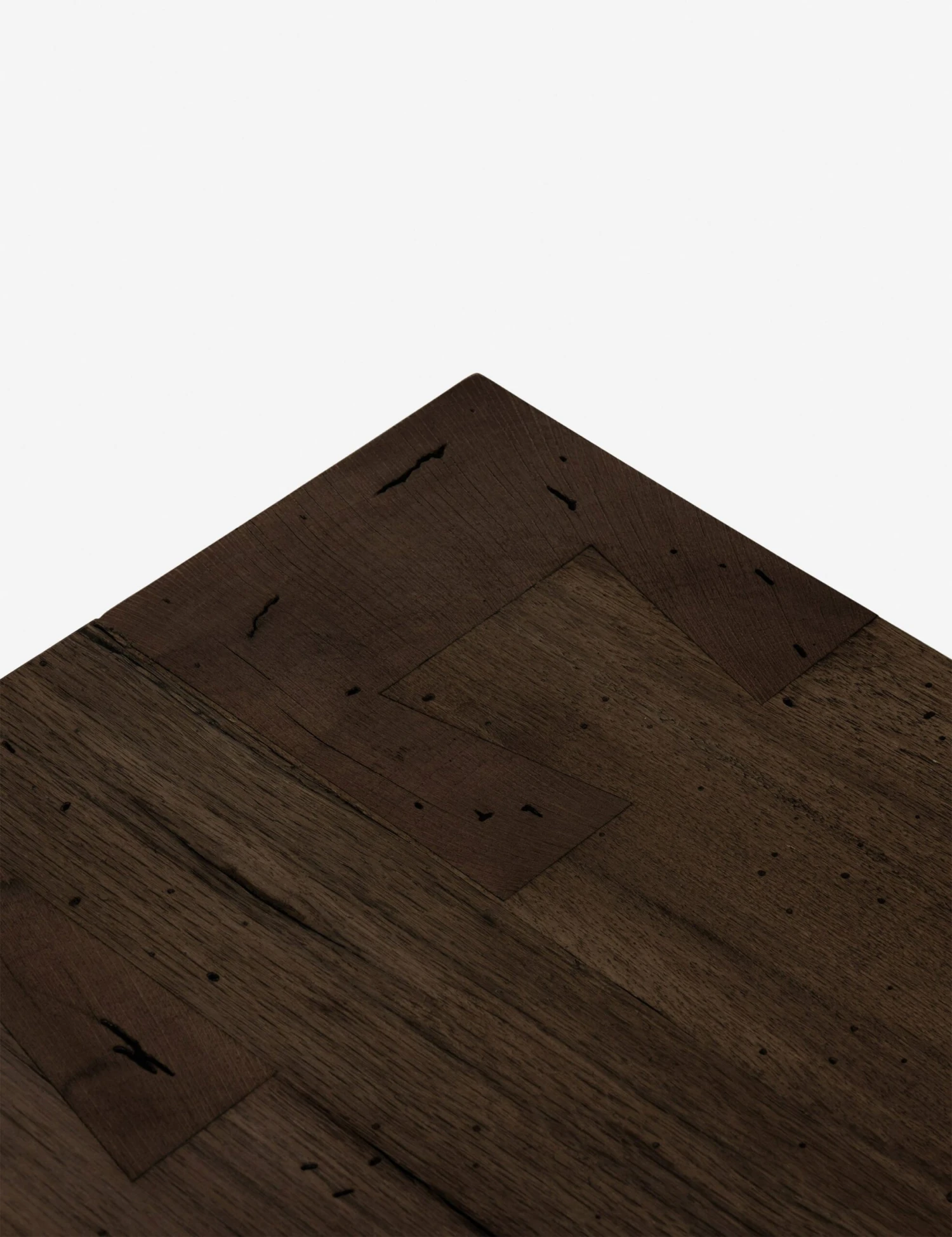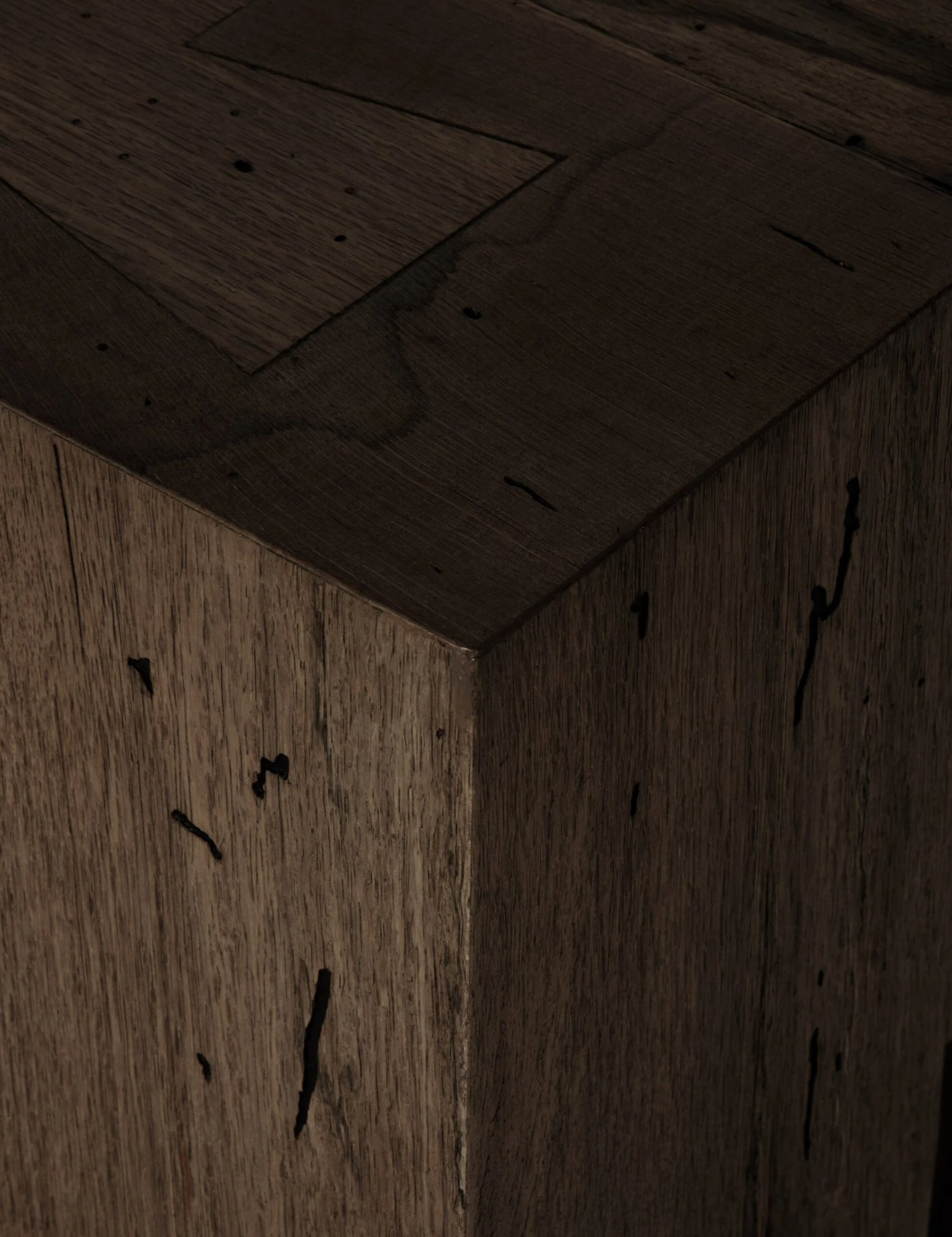 Chunky legs and dovetail joinery fashion this bench for rustic appeal. The distressed oak veneer creates a wormwood-like texture, adding endless character to its elemental design. We love the versatility of this bench for an industrial feel at your table or a flexible accent for a farmhouse edit.