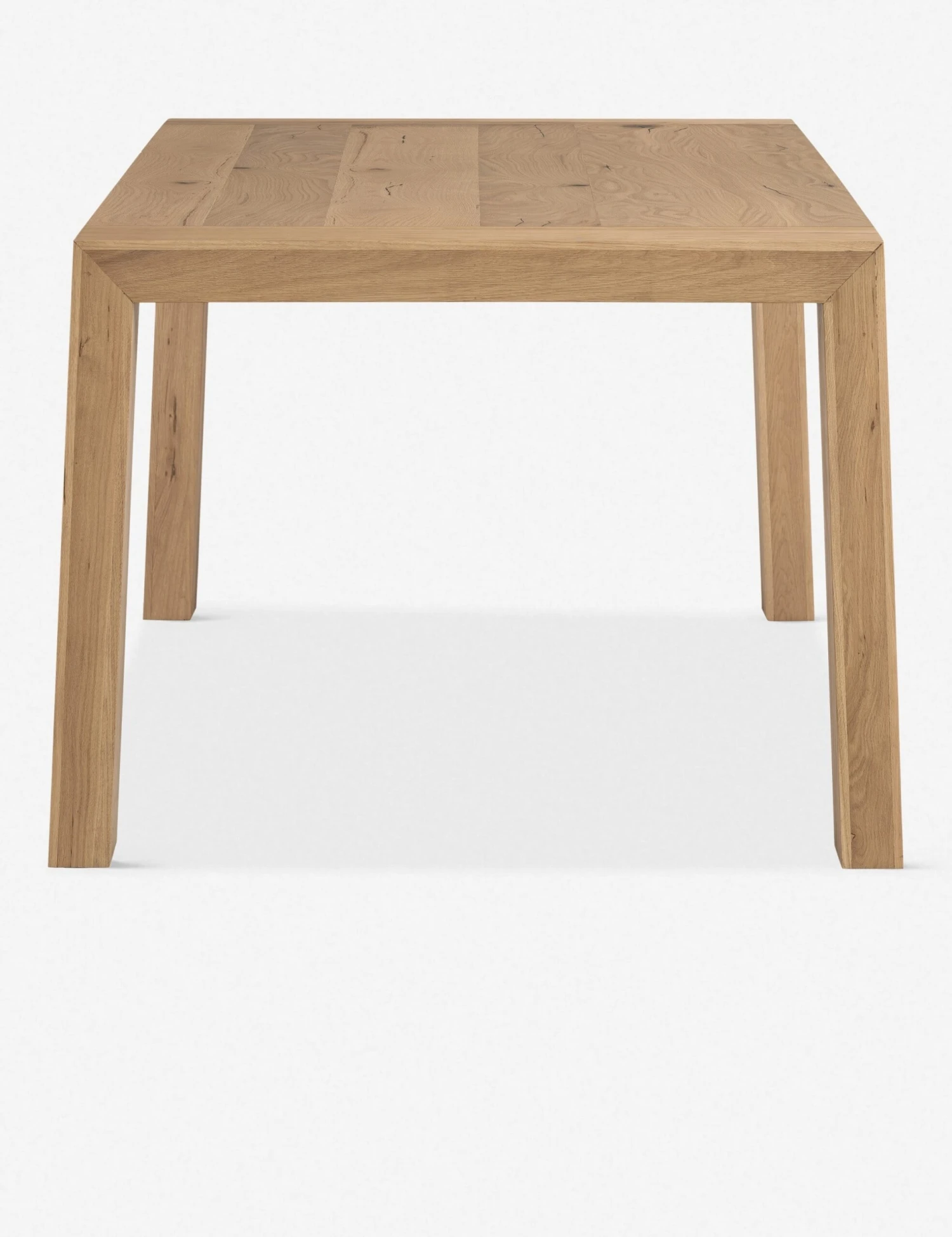 A classic rectangular dining table, reimagined with stunning details that highlight the organic appeal of the oak woodgrain. This wood kitchen table features a paneled top, with sturdy legs that splay out at a subtle angle.
