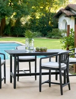Sculptural lines soften and offer dramatic appeal to the sleek black-finished cement construction of this collection. This oval dining table features a slab tabletop set on two chunky pillar legs to give it a neoclassical look. Set the foundation for a modern dining space indoors or out with the elemental silhouette of this dining table.
